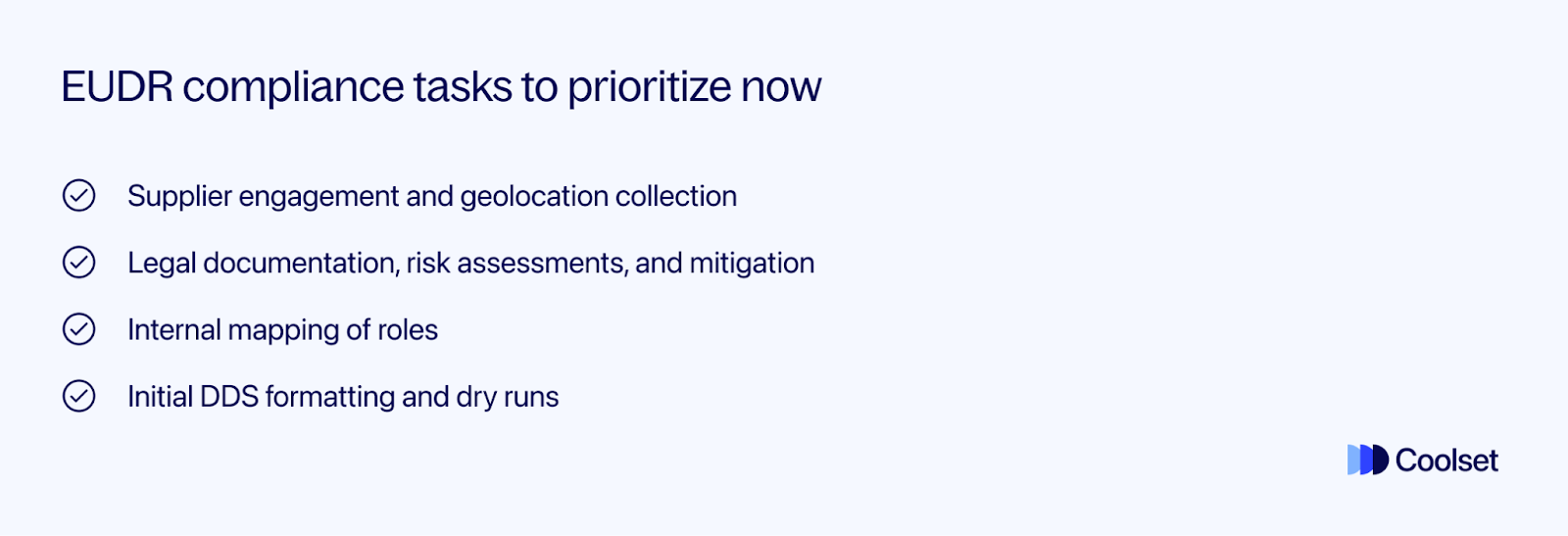 Focus on long-lead actions like supplier engagement, geolocation data collection, legal documentation, and risk assessments. These take the most time and are foundational to compliance. Early progress here gives you flexibility once the new enforcement date is confirmed.