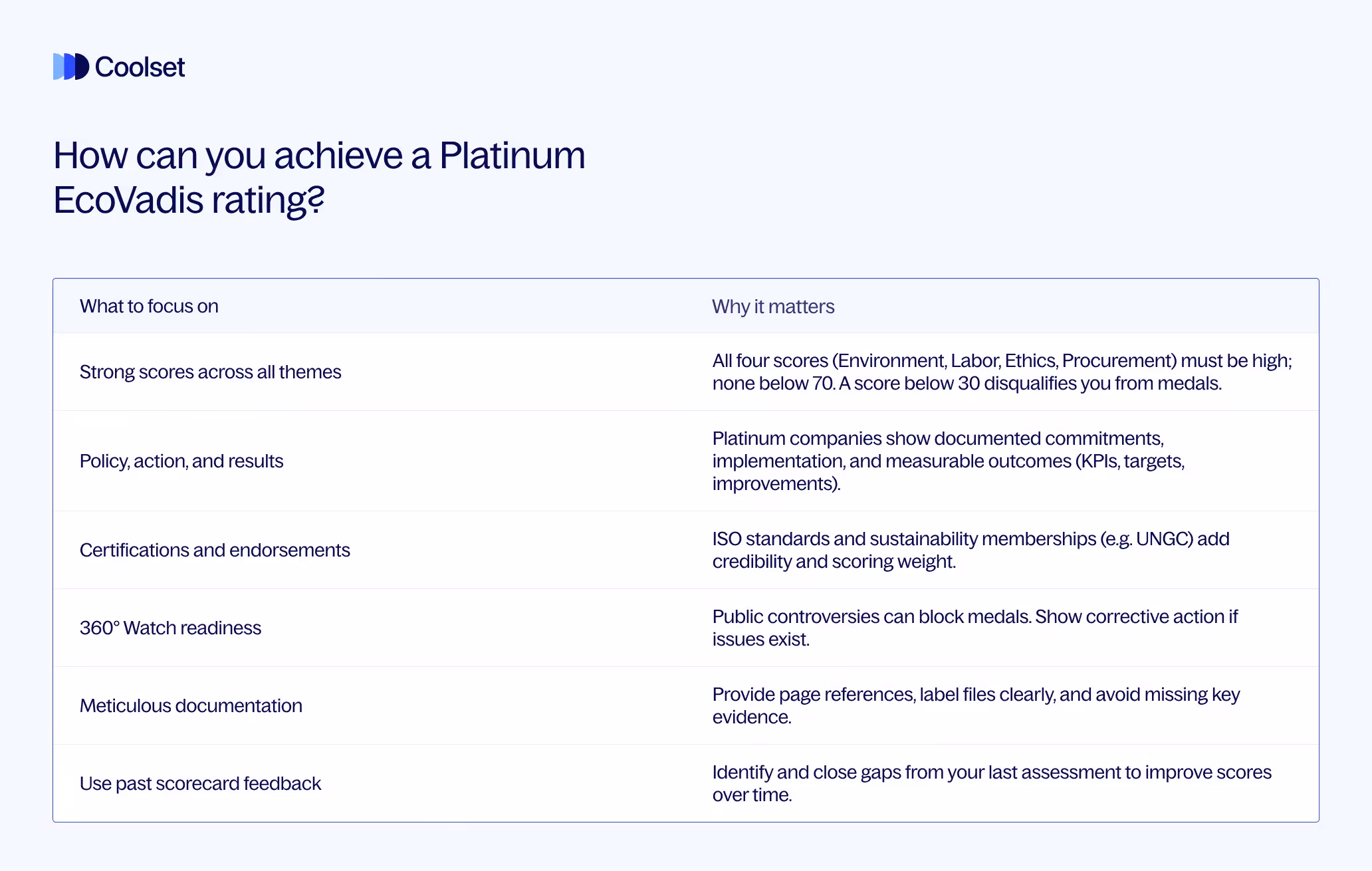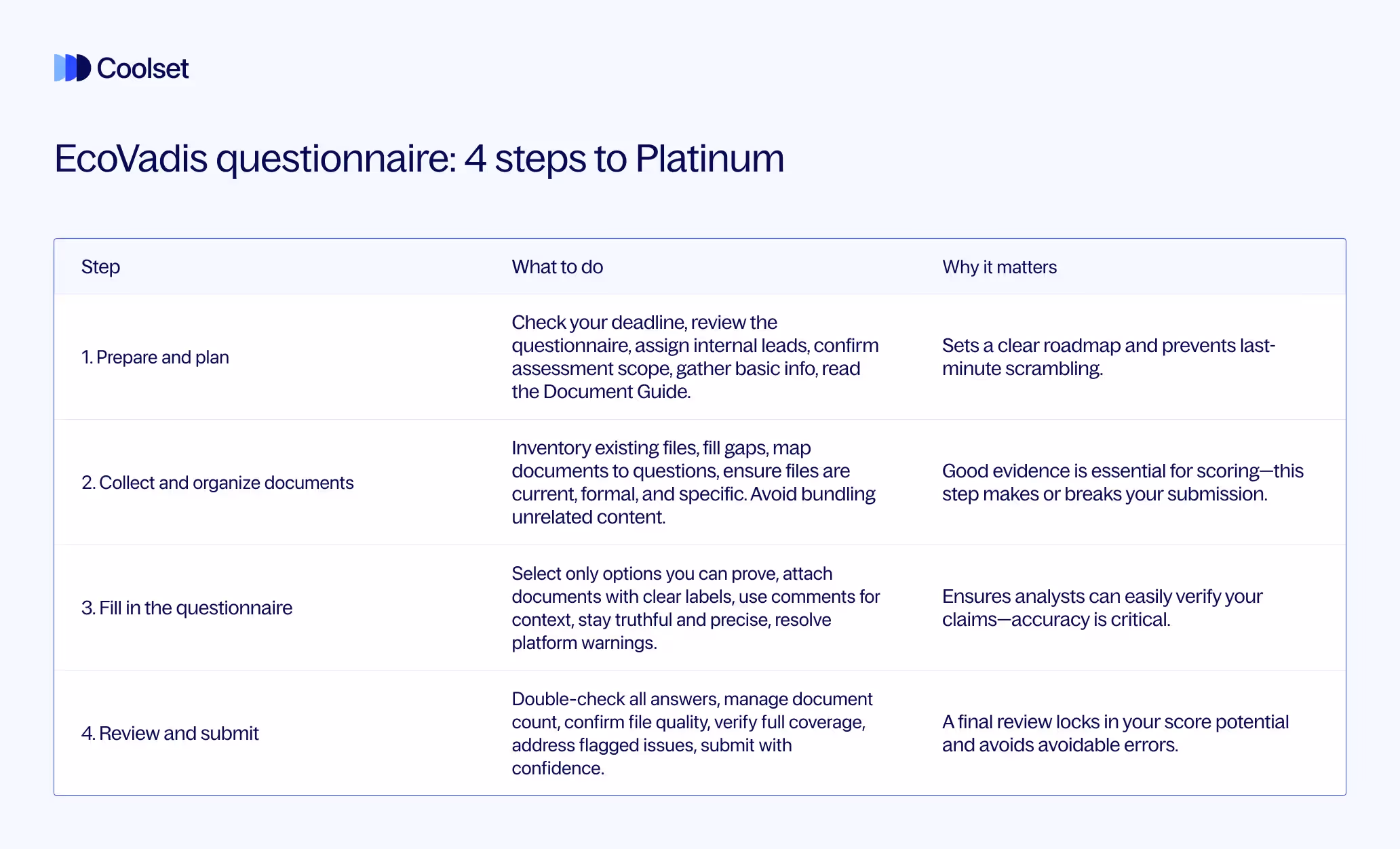 If you’re still unsure, check the EcoVadis Help Center or consider using tools like Coolset to help streamline the process. But with preparation, most mid-sized companies can handle this step internally.