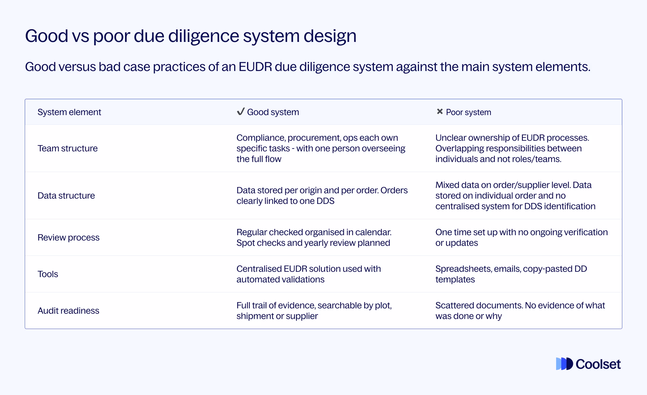 EUDR compliance isn’t a checklist. It’s a repeatable, auditable system. A defensible due diligence system must include clear workflows, assigned responsibilities, structured data management, and continuous oversight to ensure every requirement is met.