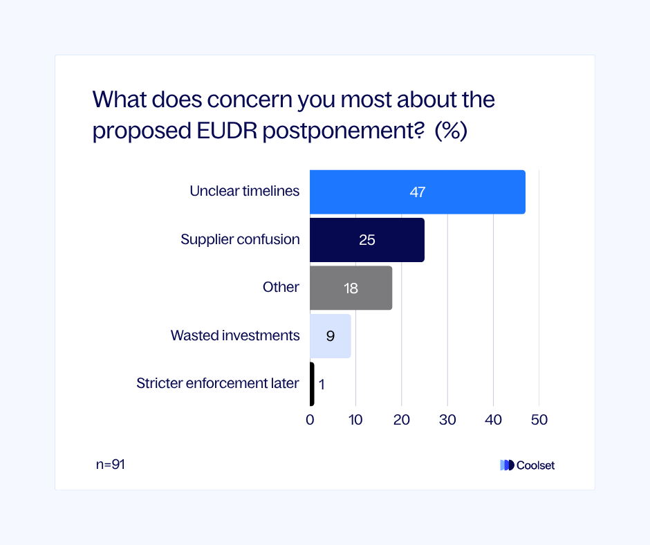 But the uncertainty is weighing on teams. When asked what concerns them most about the proposed postponement, 47% of companies pointed to unclear timelines, followed by supplier confusion (25%) and risk of wasted investments (9%).