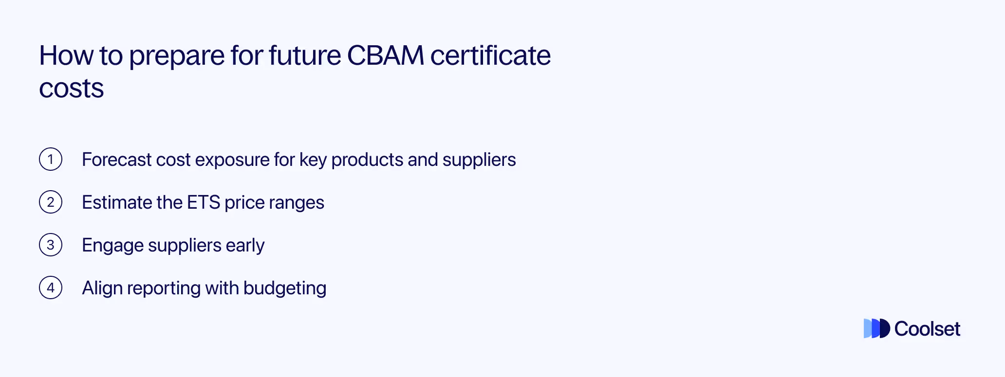 Use your quarterly CBAM reports as the basis for internal forecasting and financial planning. From 2026, these reports will become the trigger for CBAM certificate purchases, so aligning now helps streamline budgeting later.