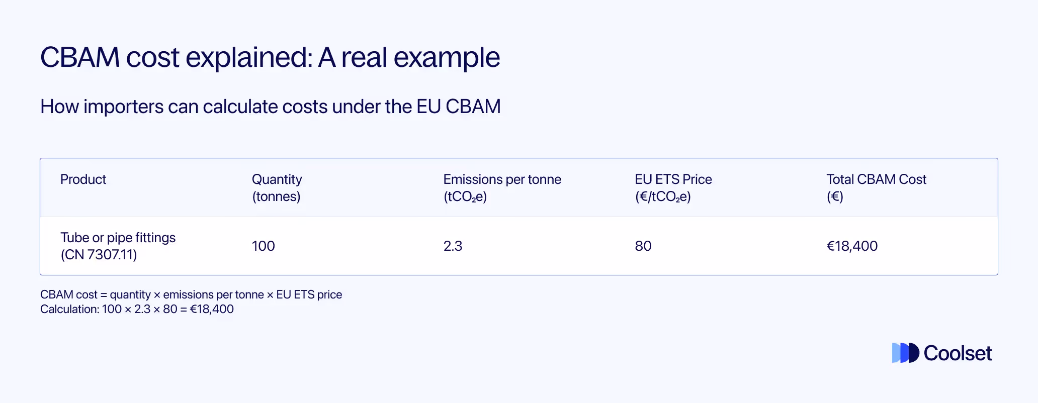 Based on the CBAM cost formula (CBAM cost = quantity × emissions per tonne × EU ETS price) let’s walk through a simple example using CN code 7307 11, which covers tube or pipe fittings of non-malleable cast iron.
