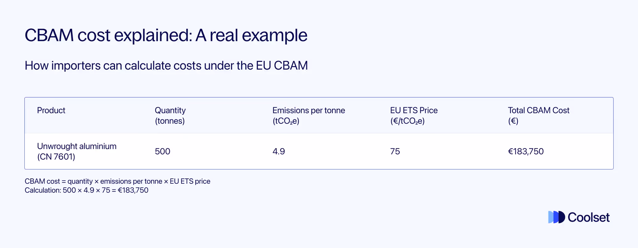 For example, let’s say you’re importing 500 tonnes of unwrought aluminium (CN code 7601). Assume your supplier provides verified emissions data showing embedded emissions of 4.9 tCO₂e per tonne. If the average weekly EU ETS price is €75 per tonne, then your CBAM cost would be: 500 × 4.9 × 75 = €183,750.