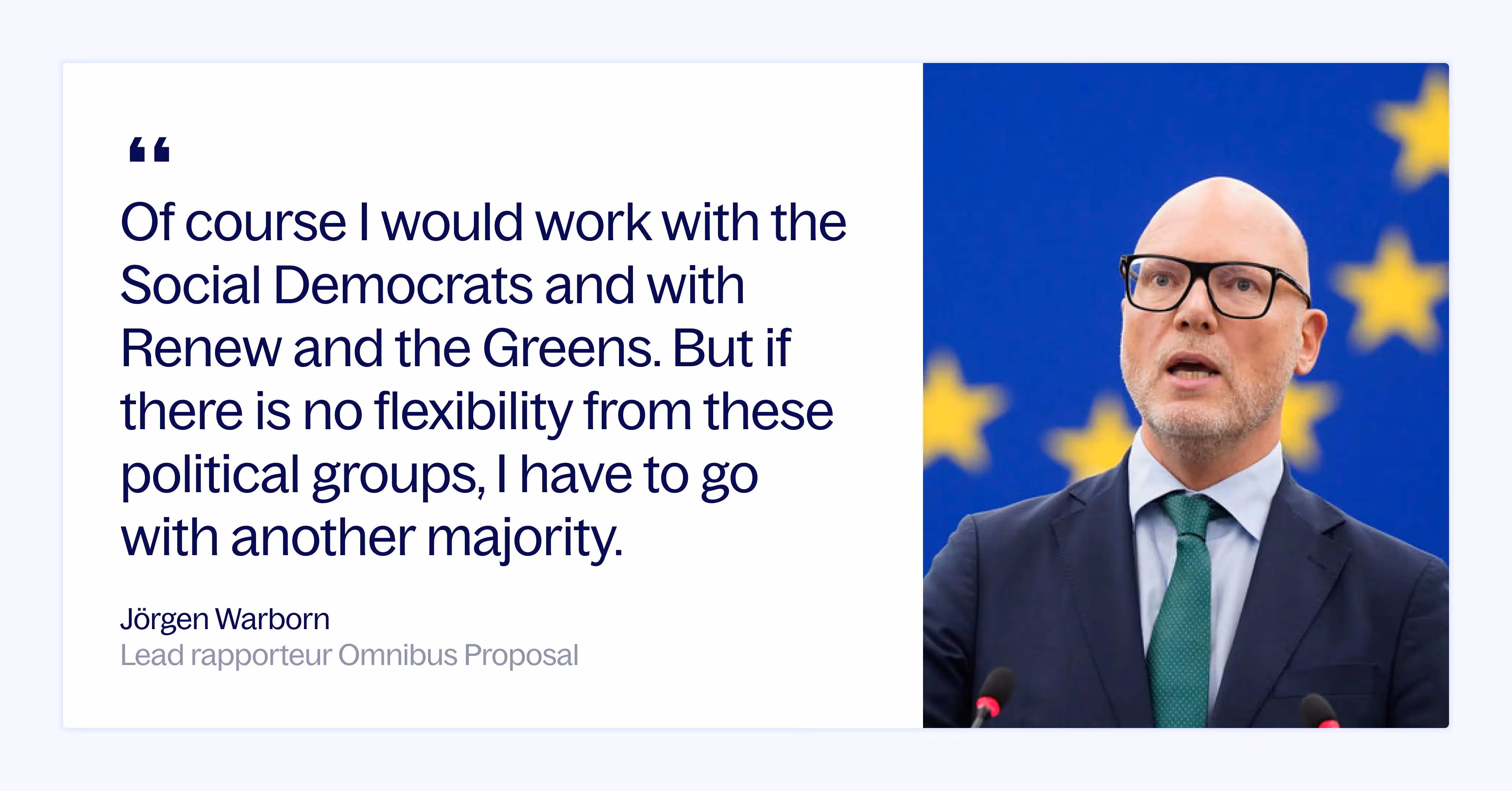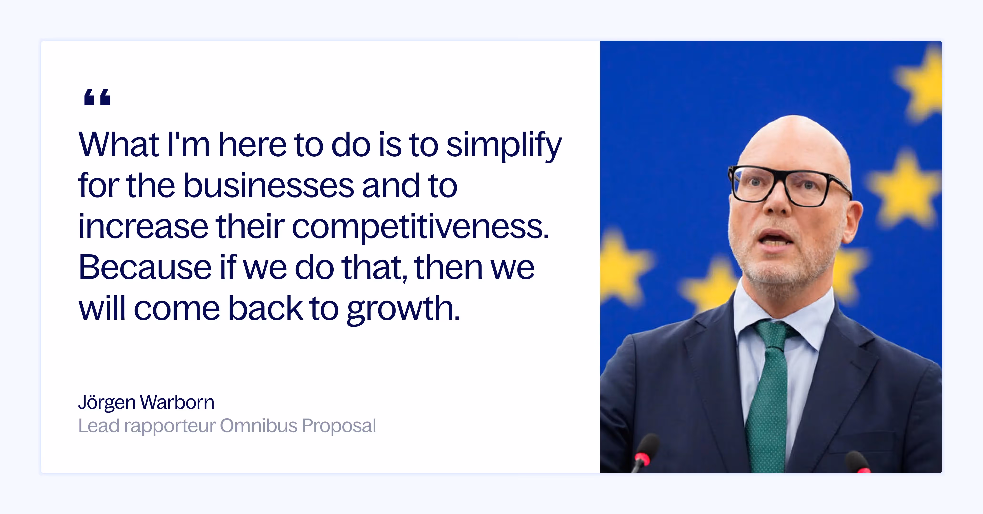 As lead rapporteur for the European People’s Party (EPP) on the Omnibus Proposal, Jörgen Warborn is one of the most influential figures shaping the future of sustainability regulation in Europe. His draft report proposes sweeping changes to the Corporate Sustainability Reporting Directive (CSRD), including raising the reporting threshold to companies with over 3,000 employees – a move that would exempt the vast majority of firms currently in scope.