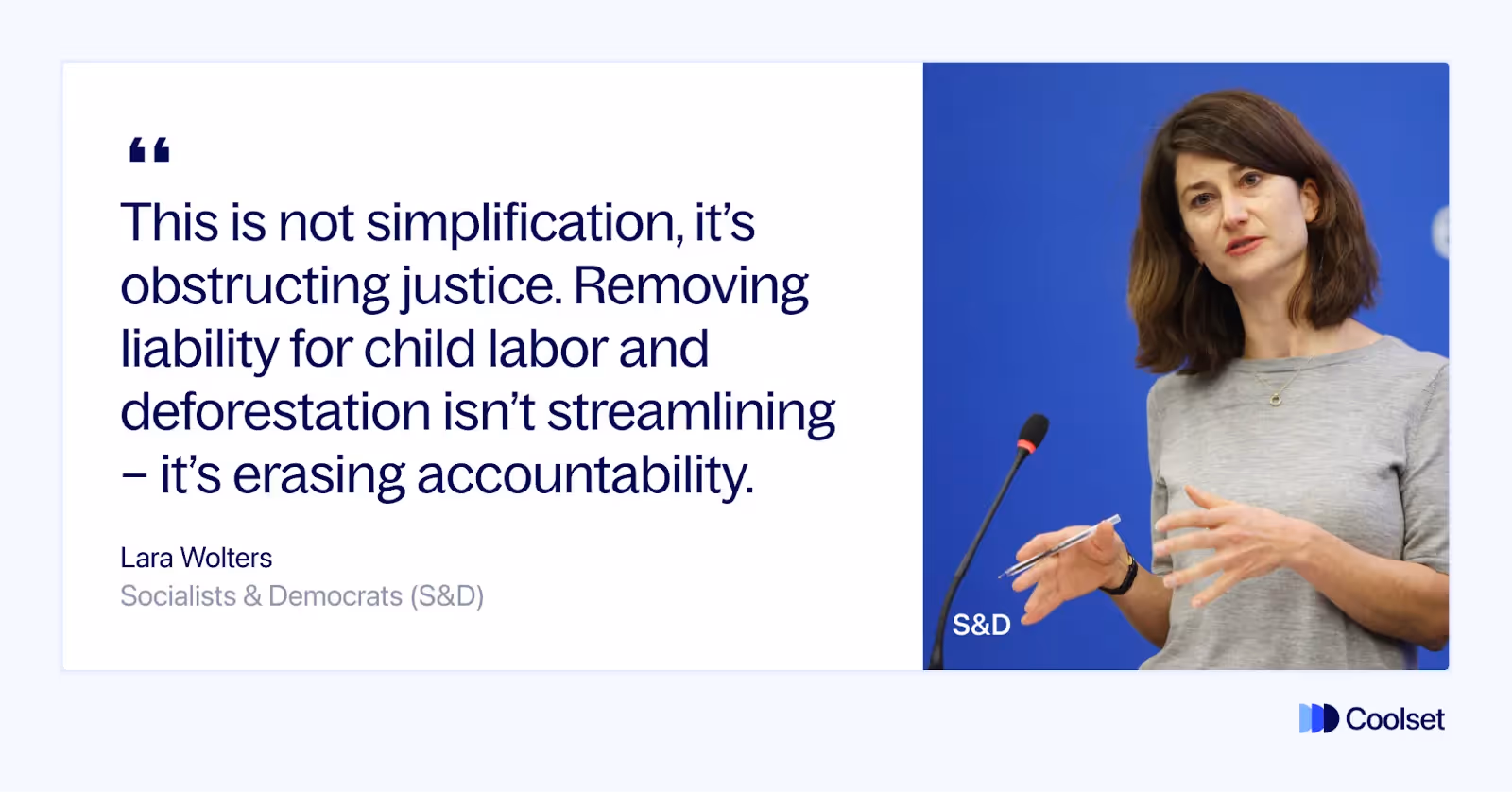“This is not simplification, it’s obstructing justice. Removing liability for child labor and deforestation isn’t streamlining – it’s erasing accountability.” – Lara Wolters (S&D)