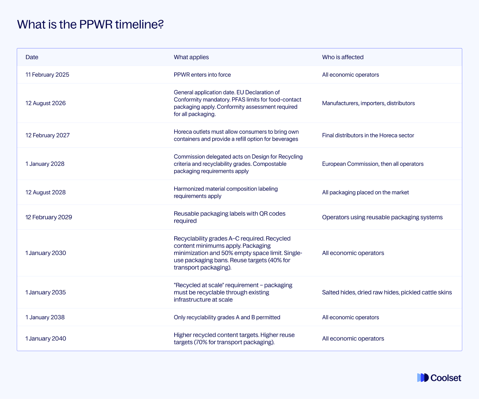 The PPWR phases in requirements over more than a decade. Not every deadline applies to importers and distributors directly – some target the Commission or member states. The timeline below highlights the dates that affect economic operators placing packaging on the EU markets.
