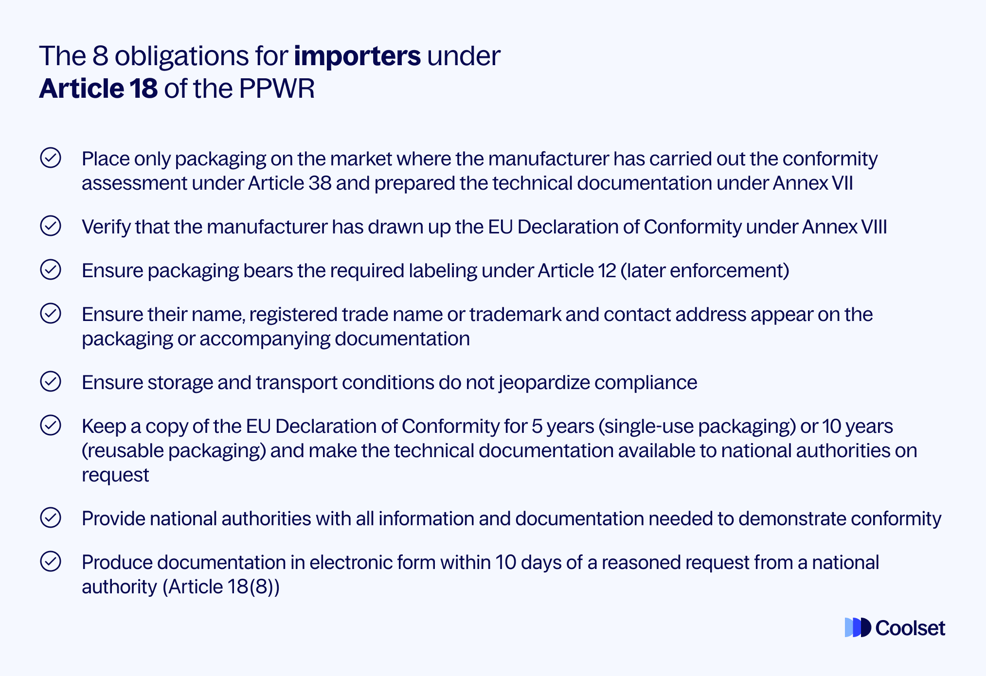 Importers carry eight specific obligations under Article 18 of the PPWR: