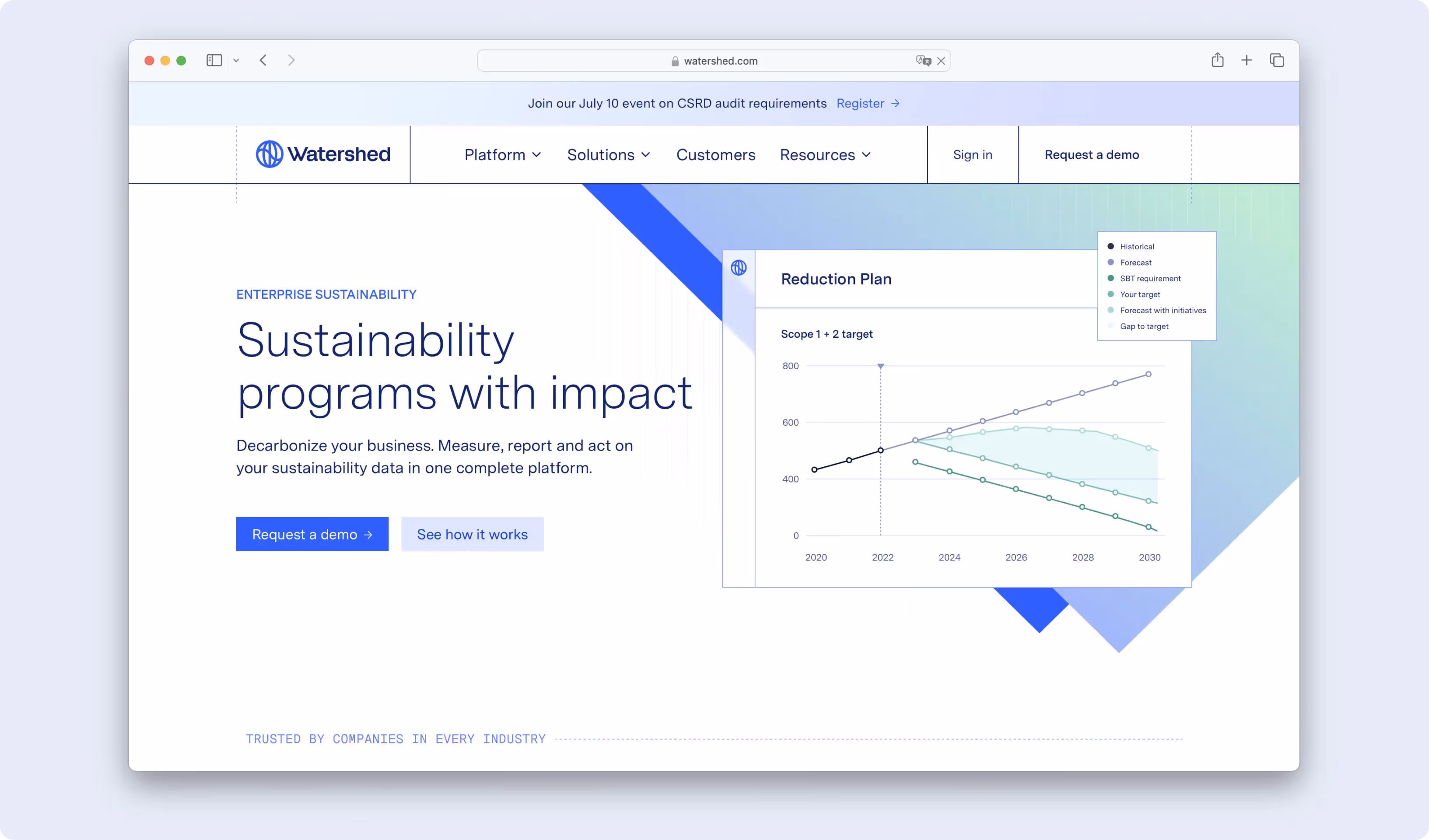 Watershed is an enterprise sustainability platform that helps businesses to measure, report, and act on their sustainability data in one place. Organizations can map out their carbon footprint, prepare and file reports to meet global regulatory standards, and set emission reduction targets to decarbonize their operations.
