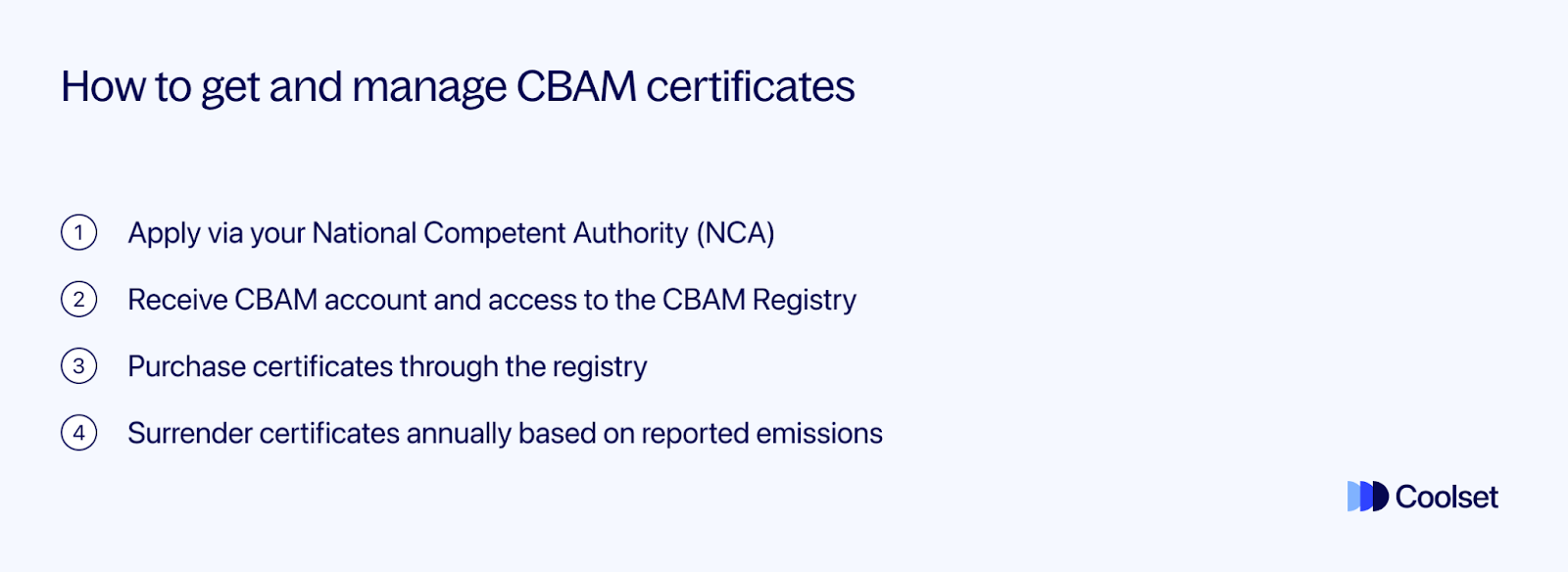 Once authorized, companies will be issued a CBAM account in the EU-wide CBAM Registry: a central platform for purchasing, holding, and surrendering certificates.