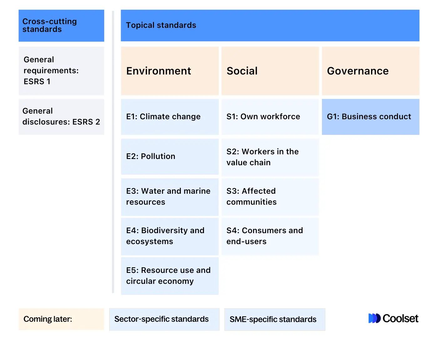 Der erste Satz der ESRS besteht aus 12 Themen. Dazu gehören 10 thematische Standards, die ESG-Angelegenheiten abdecken, und zwei übergreifende Standards, die allgemeine Kriterien sind, die für alle gelten, die der CSRD unterliegen.