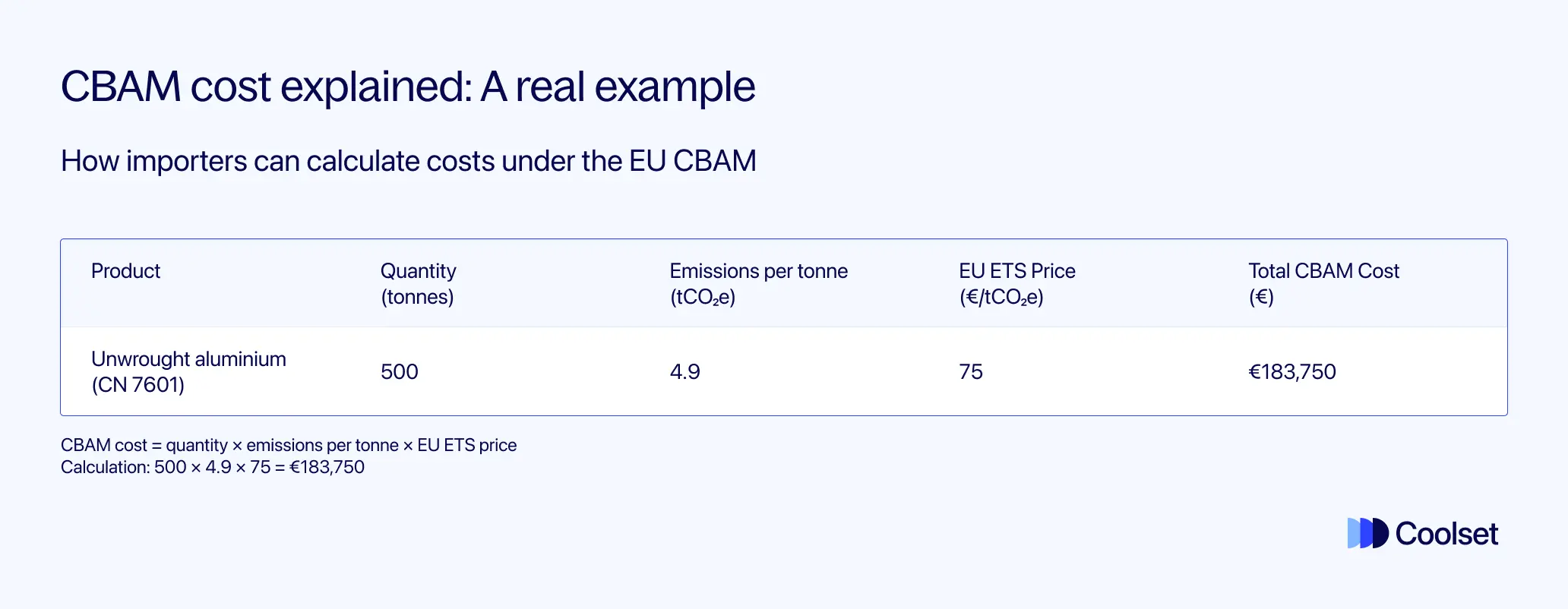 Nehmen wir zum Beispiel an, Sie importieren 500 Tonnen Rohaluminium (CN-Code 7601). Angenommen, Ihr Lieferant stellt verifizierte Emissionsdaten bereit, die eingebettete Emissionen von 4,9 tCO₂e pro Tonne zeigen. Wenn der durchschnittliche wöchentliche EU ETS-Preis 75 € pro Tonne beträgt, dann würden Ihre CBAM-Kosten betragen: 500 × 4,9 × 75 = 183.750 €.