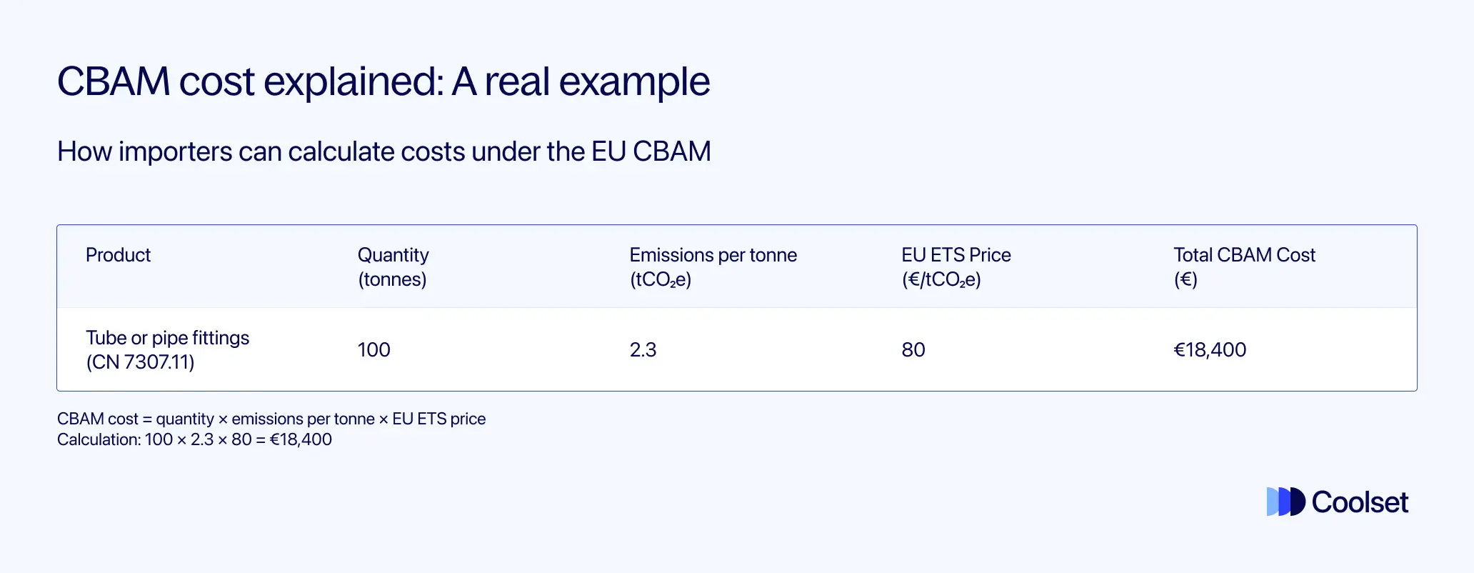 CBAM-Kosten = 100 × 2,3 × 80 = 18.400 €