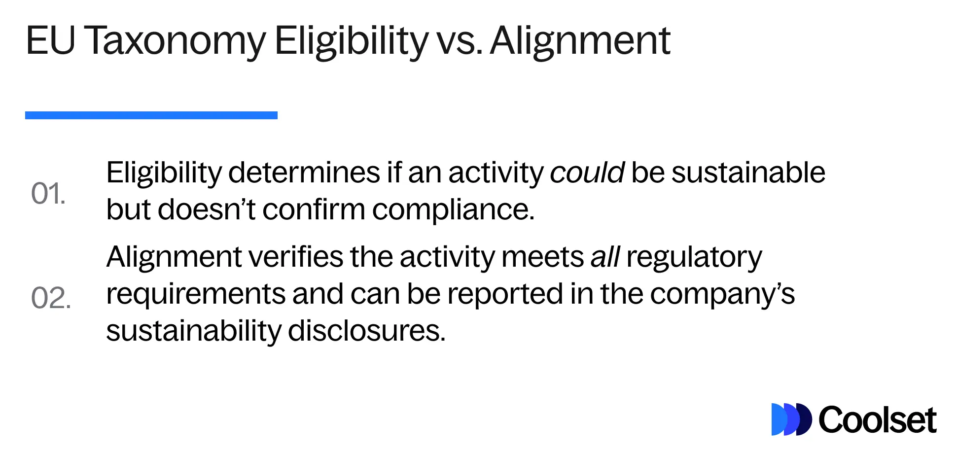 Coolset führt Unternehmen durch jeden Schritt der EU-Taxonomie-Compliance, von der Zuordnung berechtigter Aktivitäten und der Bewertung der Übereinstimmung mit wesentlichen Beitrags- und DNSH-Kriterien bis hin zur Berechnung und Berichterstattung von Taxonomie-KPIs. Die Plattform vereinfacht komplexe Prozesse mit intuitiven, umfragebasierten Workflows und automatisiert die Sammlung und Organisation von Daten, spart Zeit und reduziert Fehler.