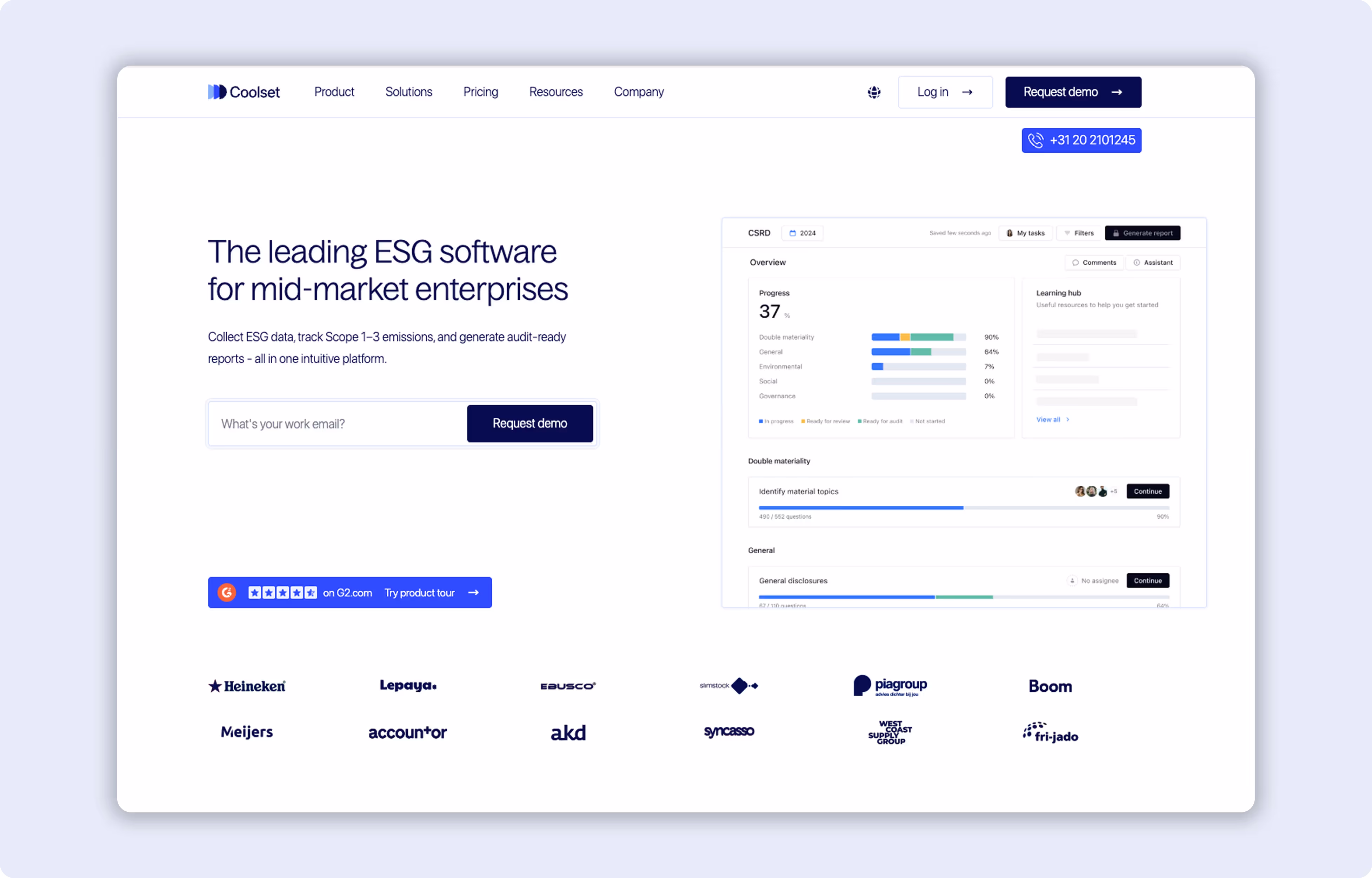 Als Herausgeber dieses Inhalts möchten wir transparent sein, warum Coolset in dieser Liste enthalten ist. Wir sind der Meinung, dass unsere Plattform erhebliche Vorteile für mittelständische Unternehmen bietet, die das Nachhaltigkeitsmanagement vereinfachen und anerkannte Standards wie das Greenhouse Gas Protocol und die EU CSRD sowie die EU Taxonomie einhalten möchten.
