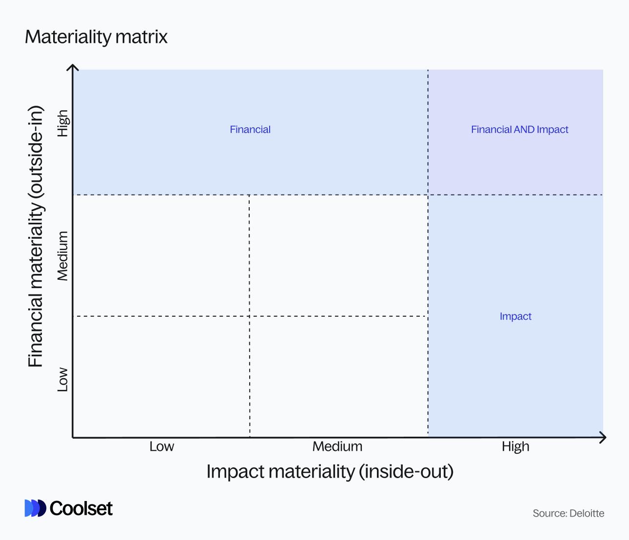 Goed om te weten: Coolset's dubbele materialiteitsfunctie automatiseert dit hele proces door je te helpen gegevens van stakeholders te verzamelen en te scoren, en de resultaten visueel samen te vatten in een matrix voor betere besluitvorming en rapportage.