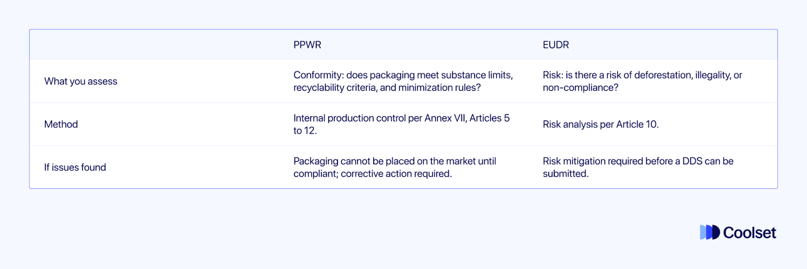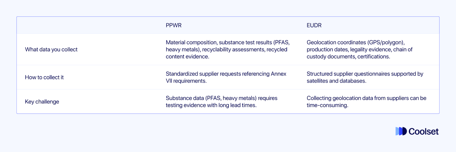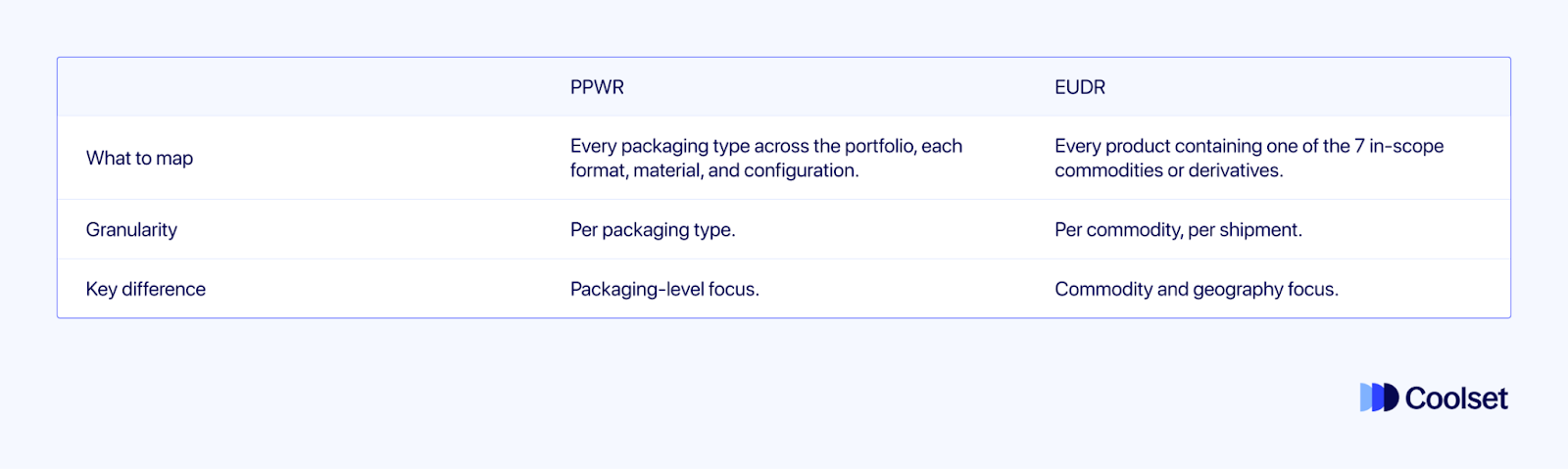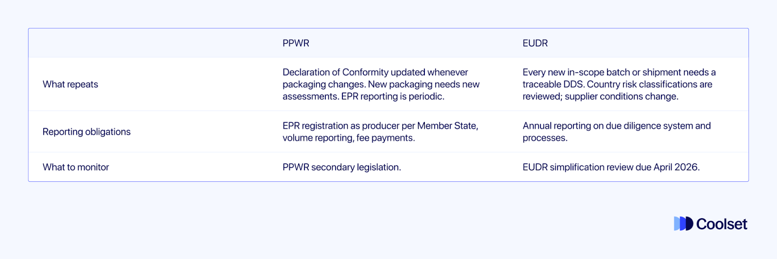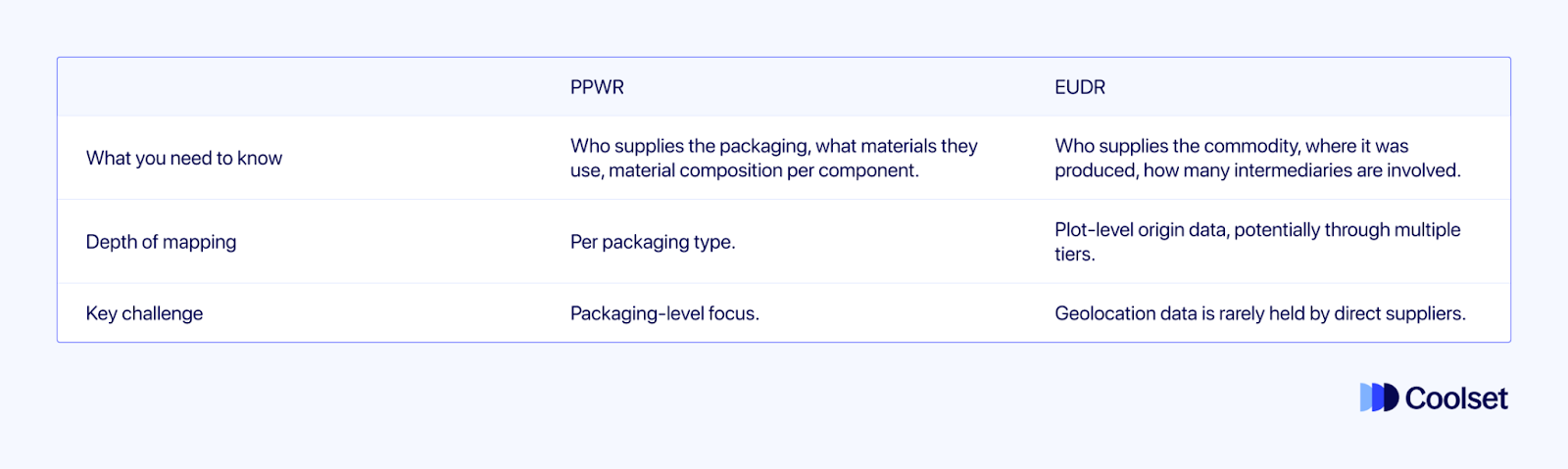 Dit artikel is gebaseerd op het Coolset-webinar 'Combining PPWR & EUDR: Key insights for your compliance strategy', gepresenteerd op 31 maart 2026 door Elisavet Diamantopoulou (Head of Research) en Frederica Crouch (Applied Researcher). Je kunt het beluisteren op onze website, Youtube of Spotify.