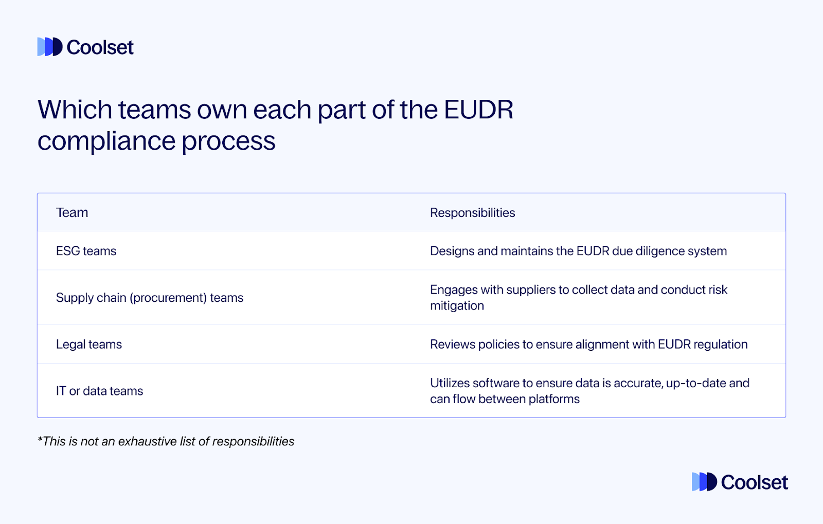EUDR-compliance wordt gedeeld over teams: ESG is verantwoordelijk voor governance en rapportage, inkoop voor leveranciersbetrokkenheid en operationele uitvoering, juridische zaken voor interpretatie en verdediging, en IT voor data-integratie en traceerbaarheidssystemen.
