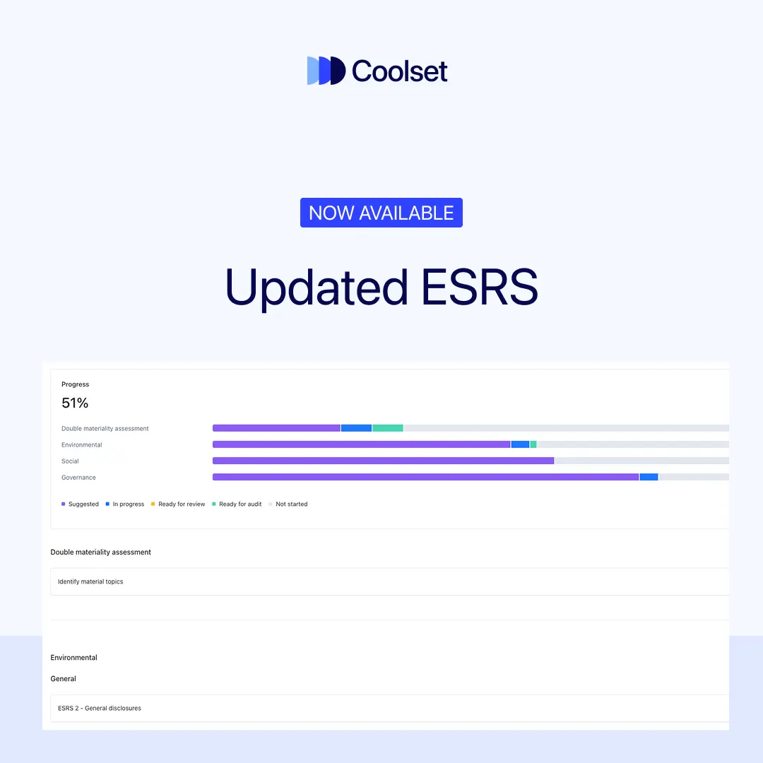 Coolset's CSRD module is already updated. Your team can continue to collect, structure, and report required disclosures in one place, always aligned with what auditors will expect.
