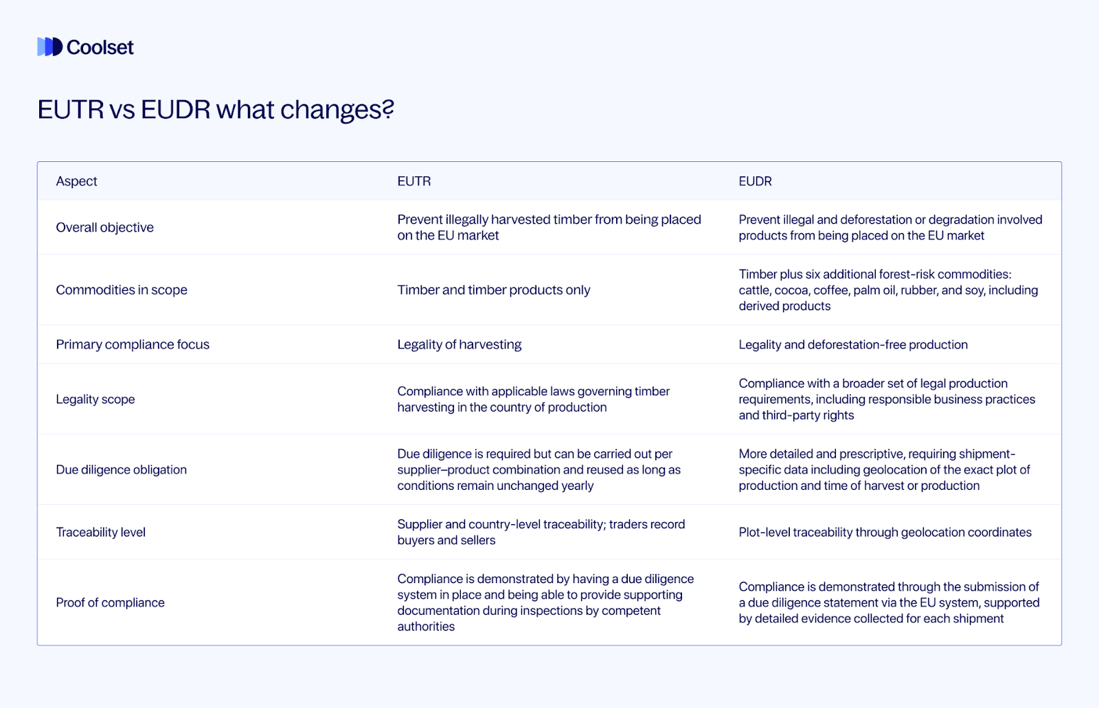De EUDR behoudt de legaliteitseis maar voegt een extra voorwaarde toe: producten moeten ontbossingsvrij zijn. Bedrijven moeten kunnen aantonen dat goederen niet zijn geproduceerd op grond die na 31 december 2020 is ontbost en, voor hout, dat ze niet zijn gekoppeld aan bosdegradatie. Hierdoor gaat EUDR due diligence verder dan alleen legaliteit en introduceert het een milieudrempel die niet bestond onder de EUTR. Zelfs de legaliteitseis wordt uitgebreid naar onderwerpen buiten het veld van legale houtkap naar verantwoord zakendoen en rechten van derden.