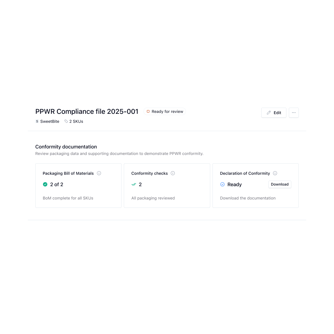 Flag non-compliance issues early with clear visibility into conformity gaps, recyclability grades and missing documentation, enabling faster packaging decisions.