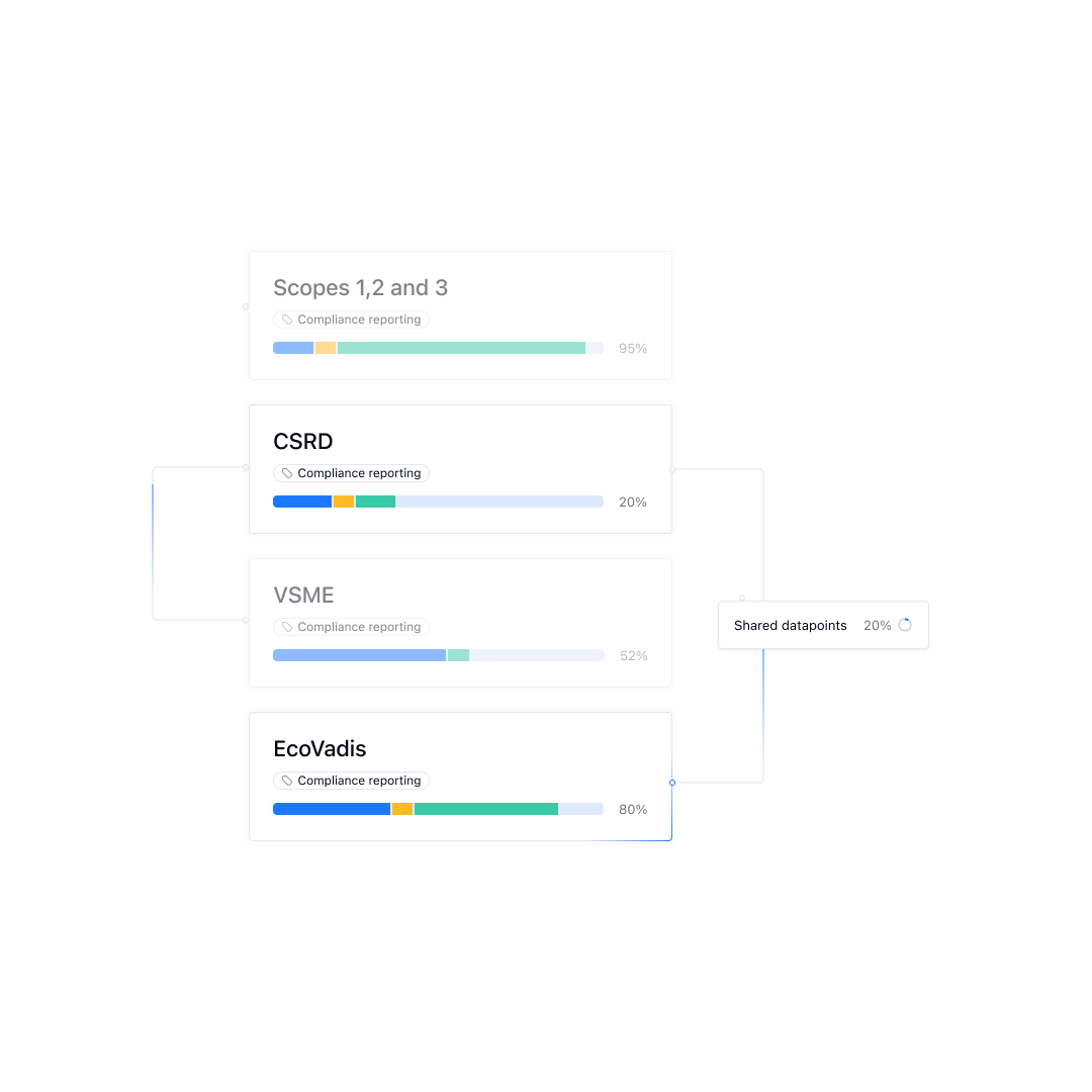 Comply with frameworks such as CSRD, EU Taxonomy and EcoVadis using guided templates, smart autofills, and suggested answers. Sync shared data across frameworks so you only enter it once.