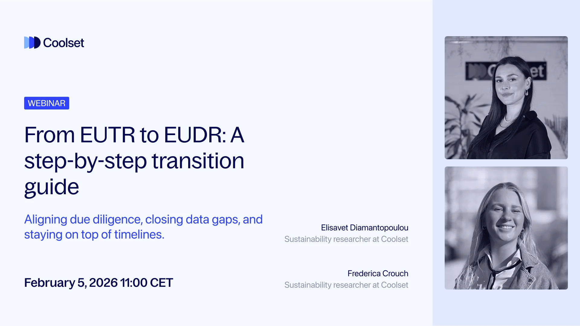 On Thursday, 5 February at 11am CET, Coolset sustainability researchers will host a 45-minute live session with Q&A on how to adapt existing EUTR processes for EUDR, what new data needs to be collected, and how to stay compliant during the transition without duplicating effort.